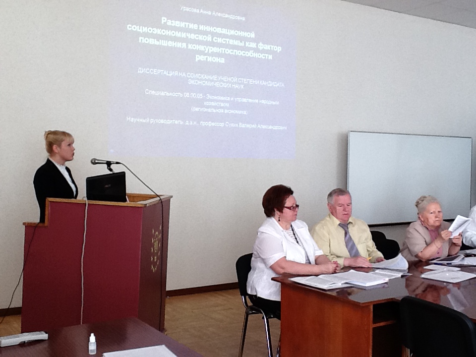 Ее работа «Развитие инновационной социоэкономической системы как фактор повышения конкурентоспособности региона» вызвала заинтересованный отклик членов совета. Оппонентами по диссертации выступили д.э.н., профессор Пыткин А.Н. и к.э.н., директор Пермского филиала МИРБИС Казанцева М.И.