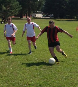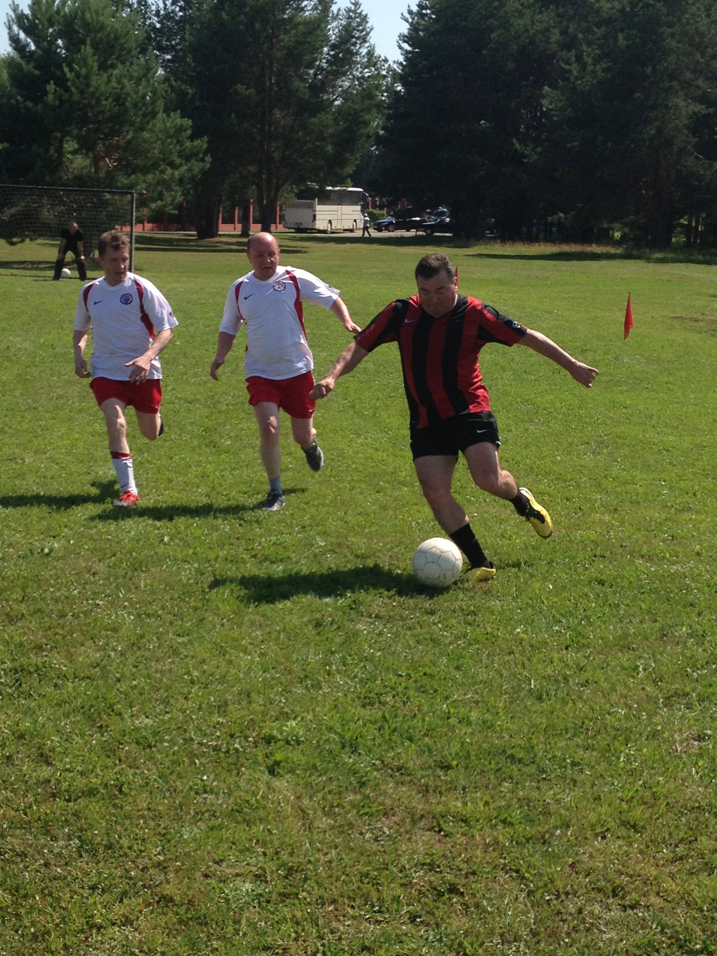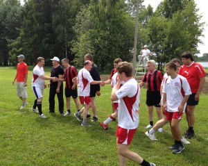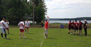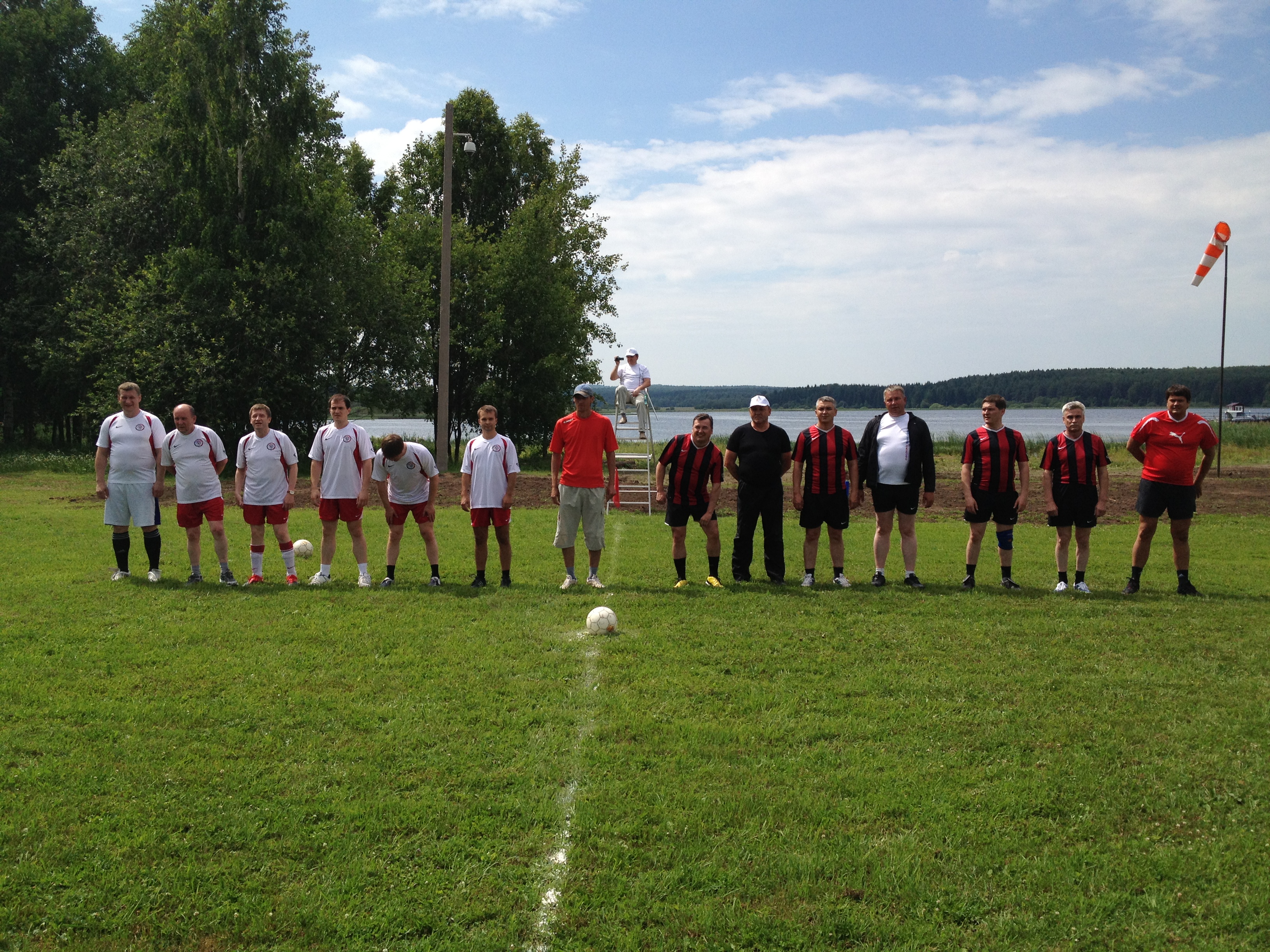 Построение перед свистком о начале. «Сборная округа 23» в красно-черных цветах, «сборная остального мира» в красно-белых