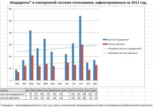 Разговоры о новой системе голосования идут уже не первый год. И из года в год вопрос переносится или отклоняется, а количество сбоев системы неуклонно растет. Вот какой аргумент приводят специалисты — анализ количества технических сбоев системы голосования в 2011 году.