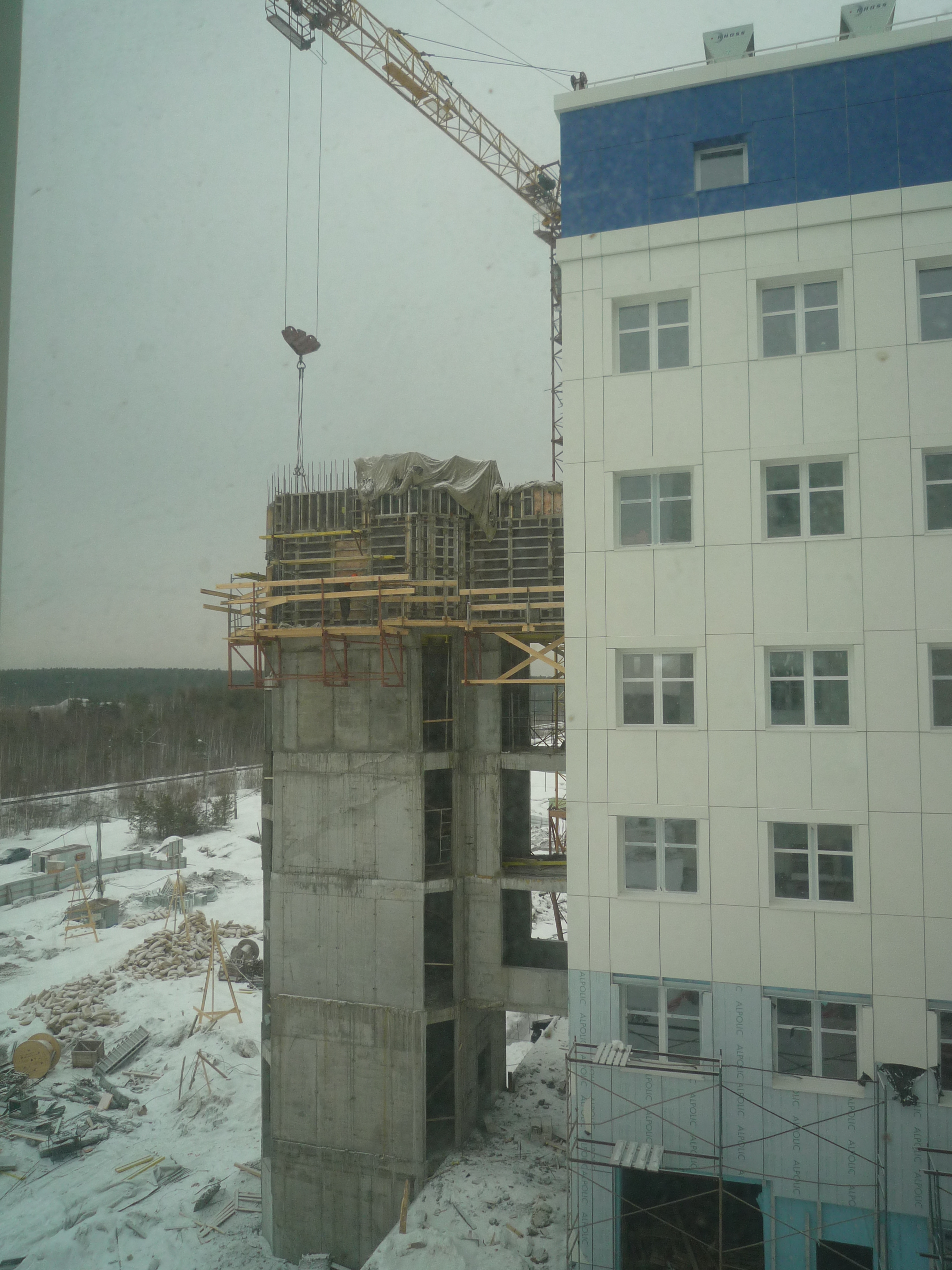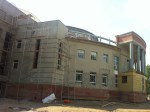 Фасадные работы проводит ООО «Техспектр» (руководитель Горелов Андрей Сергеевич). Ждут поставки синего композита, для окончания работ.